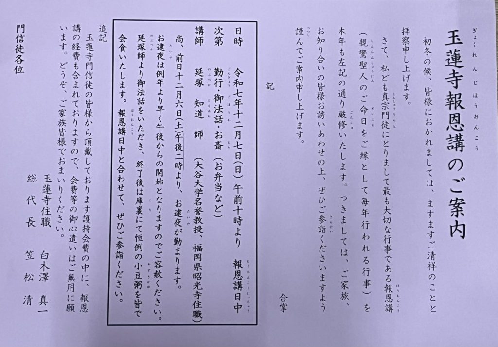 玉蓮寺報恩講逮夜…………12/6(土)14:00〜